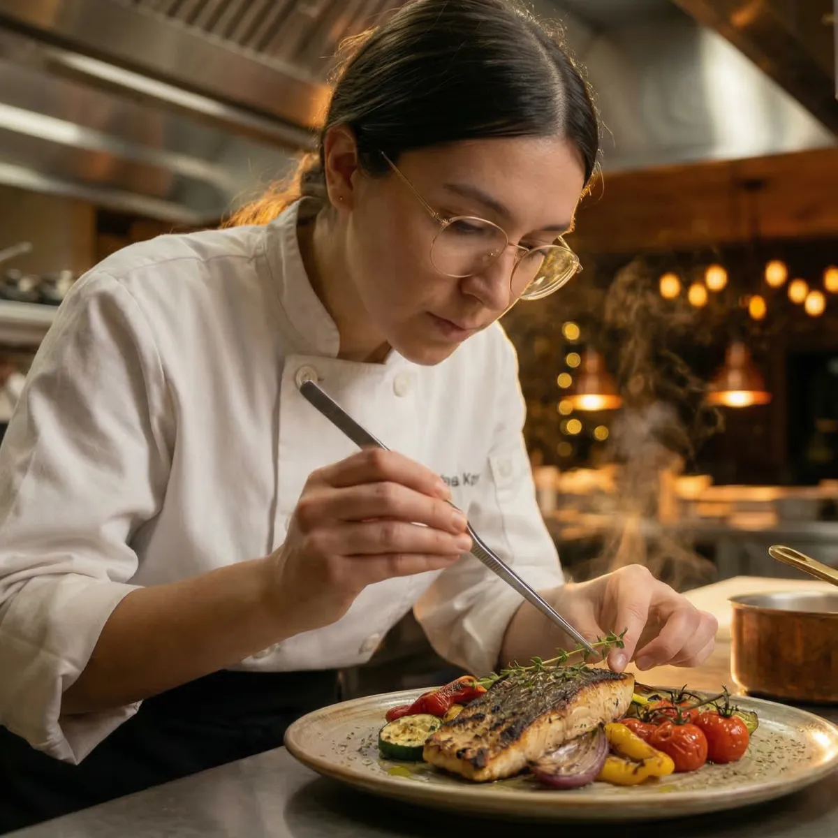 Su cocina es robusta sin ser pesada, compleja sin perder claridad. Trabaja en estrecha armonía con el fuego —leña, brasas, vapor— convirtiendo cada técnica en un acto casi ceremonial. No hay artificio en sus platillos: hay honestidad, hay historia, hay dos culturas que en sus manos nunca compiten, siempre se complementan.